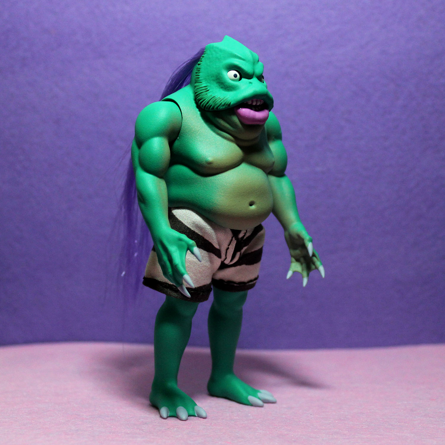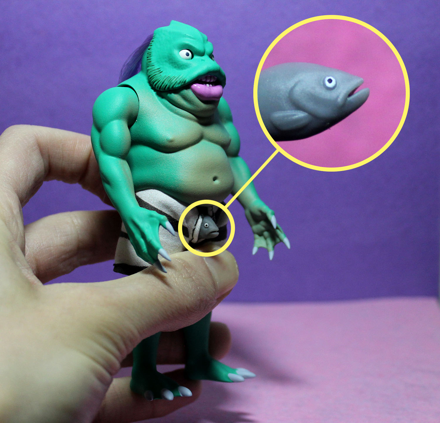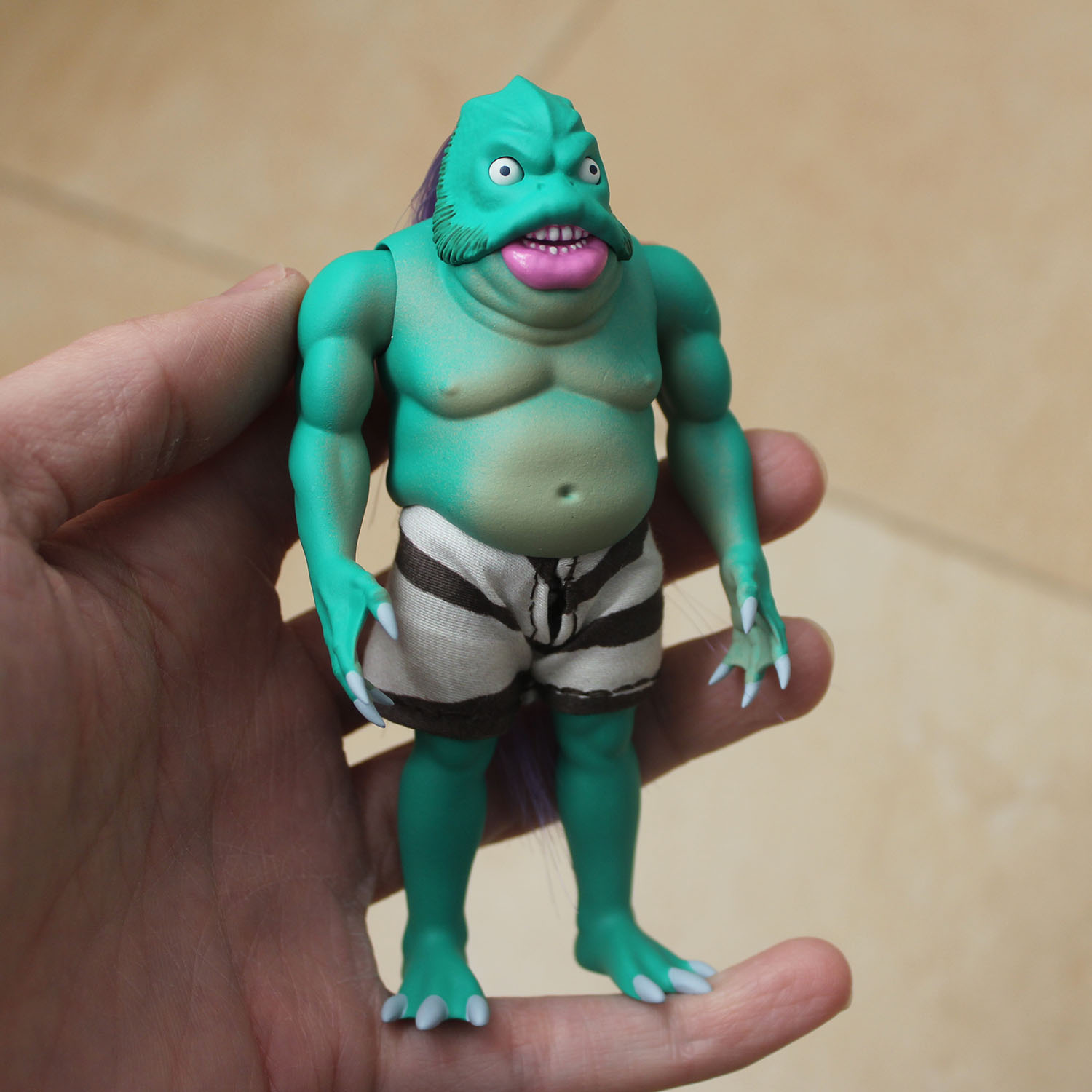 One of a kind -Resin -2 points of articulation (arms) -11'5 cm tall (4.5 inches) -Handmade clothes -Push the tail and a fish will stick out! -Bagged with header card Orders take about 1 week to be ready for shipping